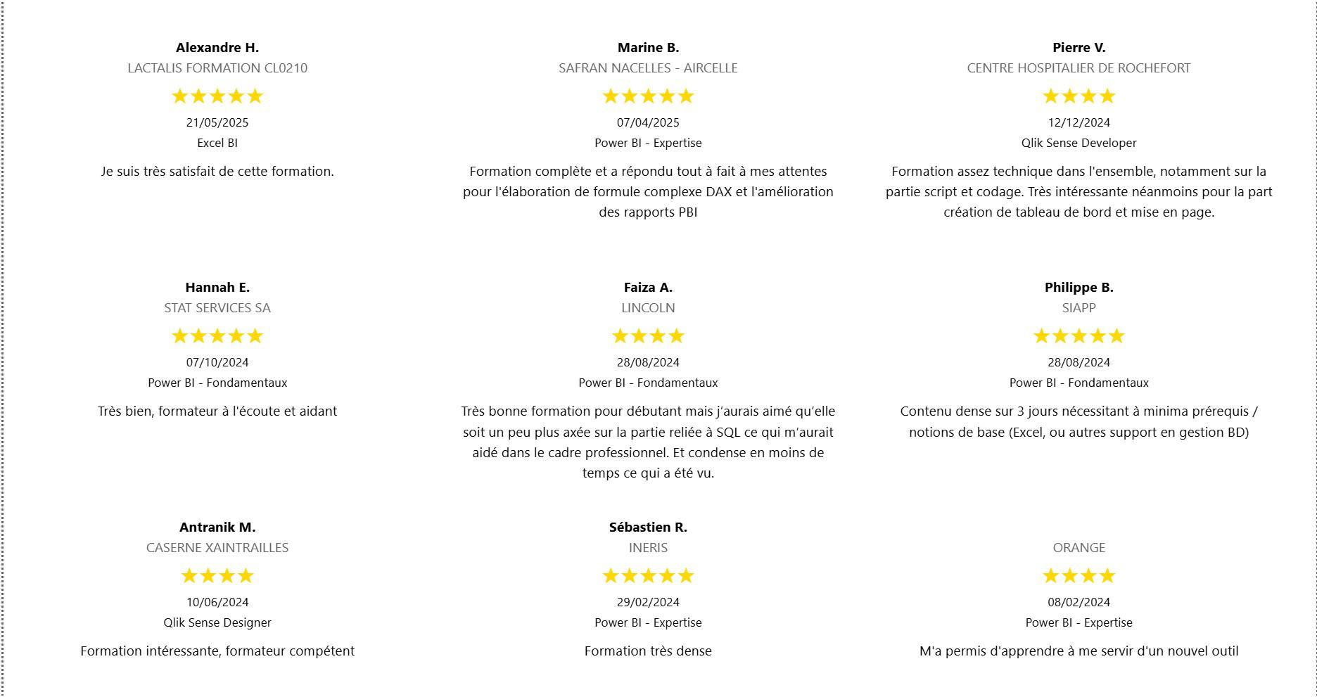 Nos consultants formateurs sauront vous guider vers la maitrise des logiciels de Business Intelligence et l’adoption des bonnes pratiques, grâce à une pédagogie éprouvée et une expérience riche auprès de TPE et PME, ou de grandes entreprises comme les Galeries Lafayette, Sanofi ou Air France. Nous facilitons aussi la transition vers vos nouveaux systèmes d'information ou le paramétrage et la mise en peuvre de vos solutions de gestion Sage.